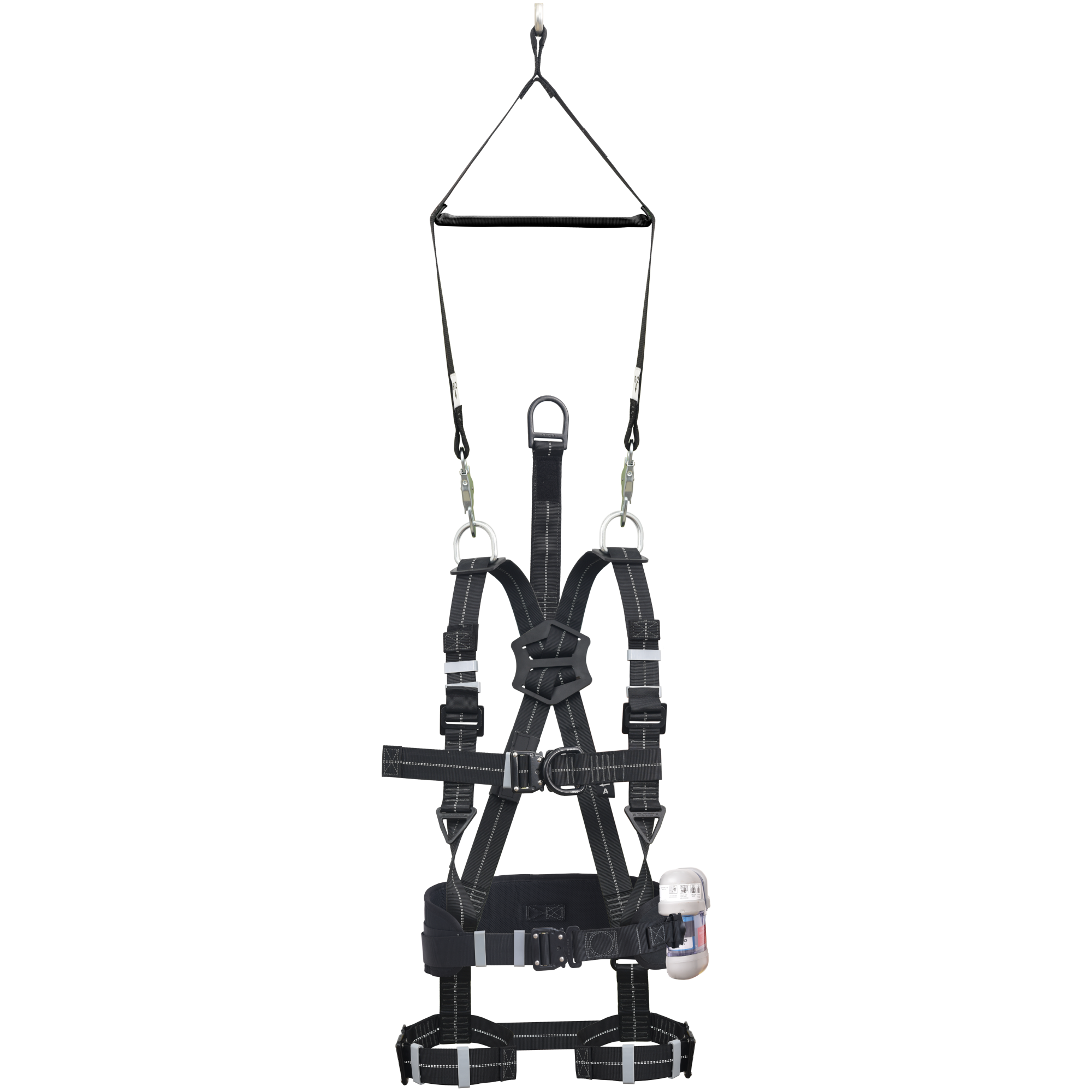 - Befestigungspunkte: 1 dorsaler D-Ring (A), 1 D-Ring am dorsalen Verlängerungsgurt (A) und 1 sternaler D-Ring (A) für das Absturzsicherungssystem, 1 D-Ring an jeder Schulter zur Rettung